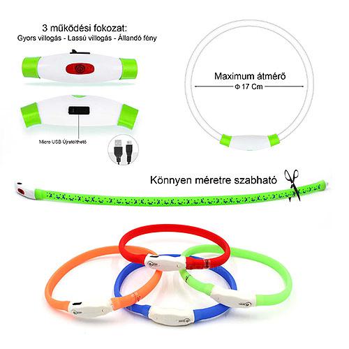 Méretre vágható, akkus, tölthető, ledes kutyanyakörv maximum 17cm es átmérővel (piros, narancs, zöld, kék)