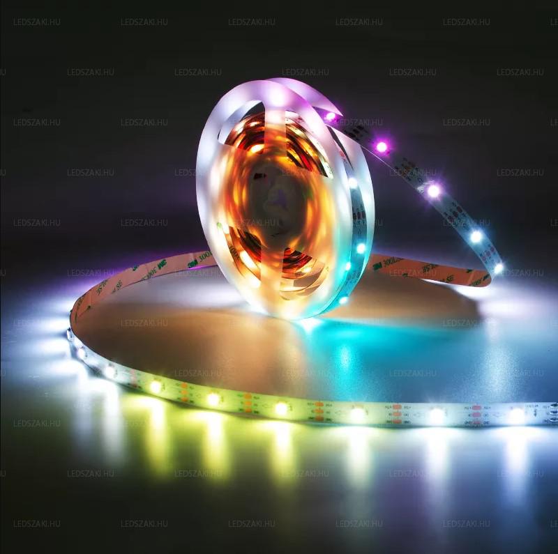 LED szalag: 30 LED/m sűrűségű, 5050-es chippel ellátott, ragasztható hátoldallal – könnyen rögzíthető bármilyen sima felületre.